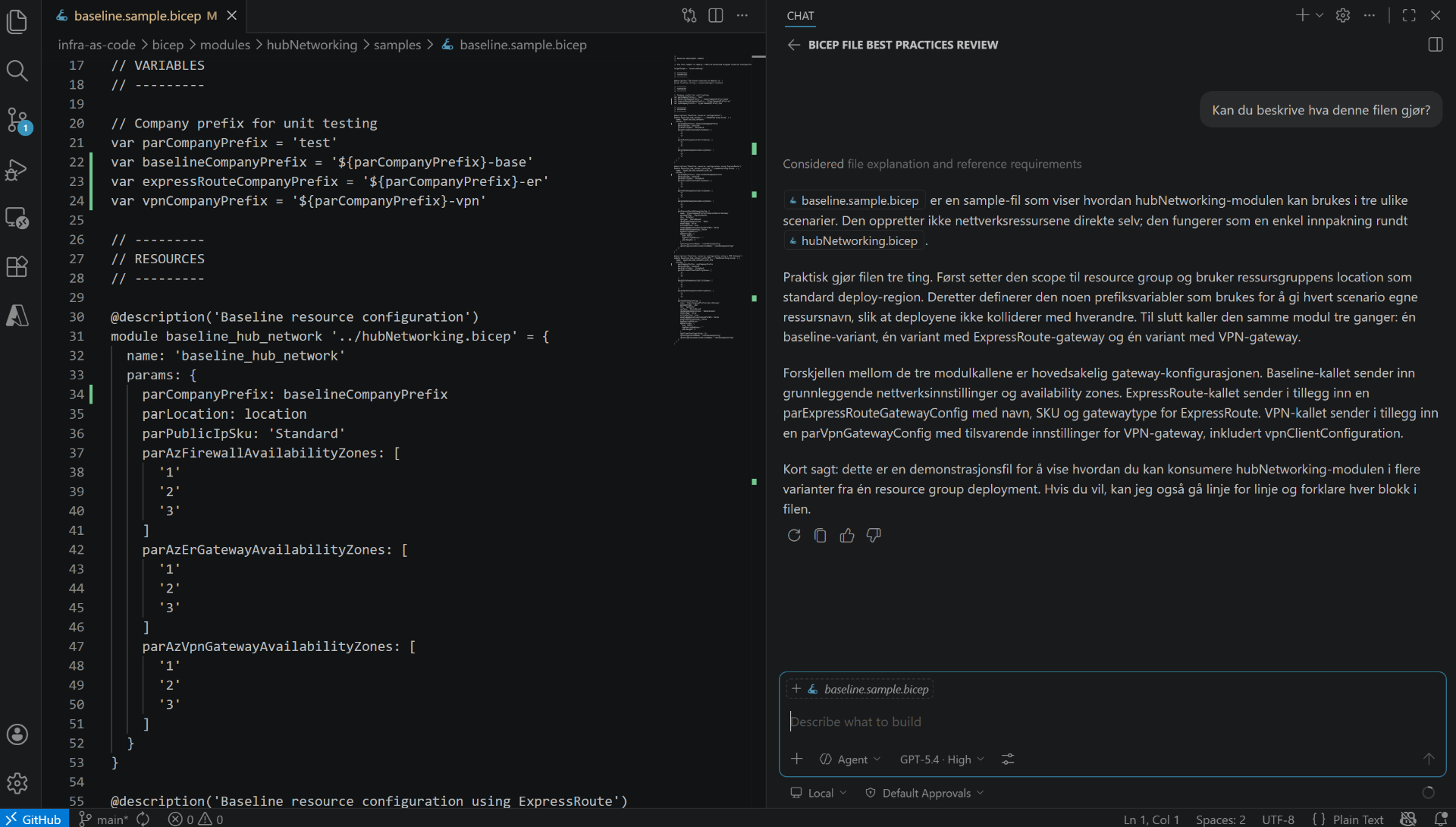 For eksempel kan den beskrive hvordan en fil setter scope til resource group, bruker regionen som standard deploy‑område og gjenbruker samme modul med ulike konfigurasjoner som VPN‑ eller ExpressRoute‑gateway.