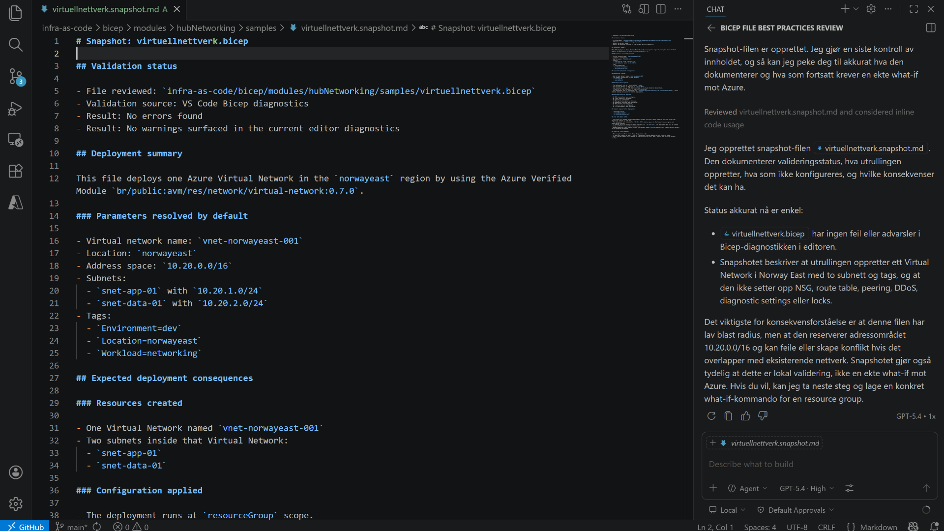 Før utrulling kan MCP lage et snapshot av Bicep‑filen. Da får du bekreftet at det ikke finnes feil eller advarsler, samtidig som du får oversikt over hvilke ressurser som påvirkes av deployen.