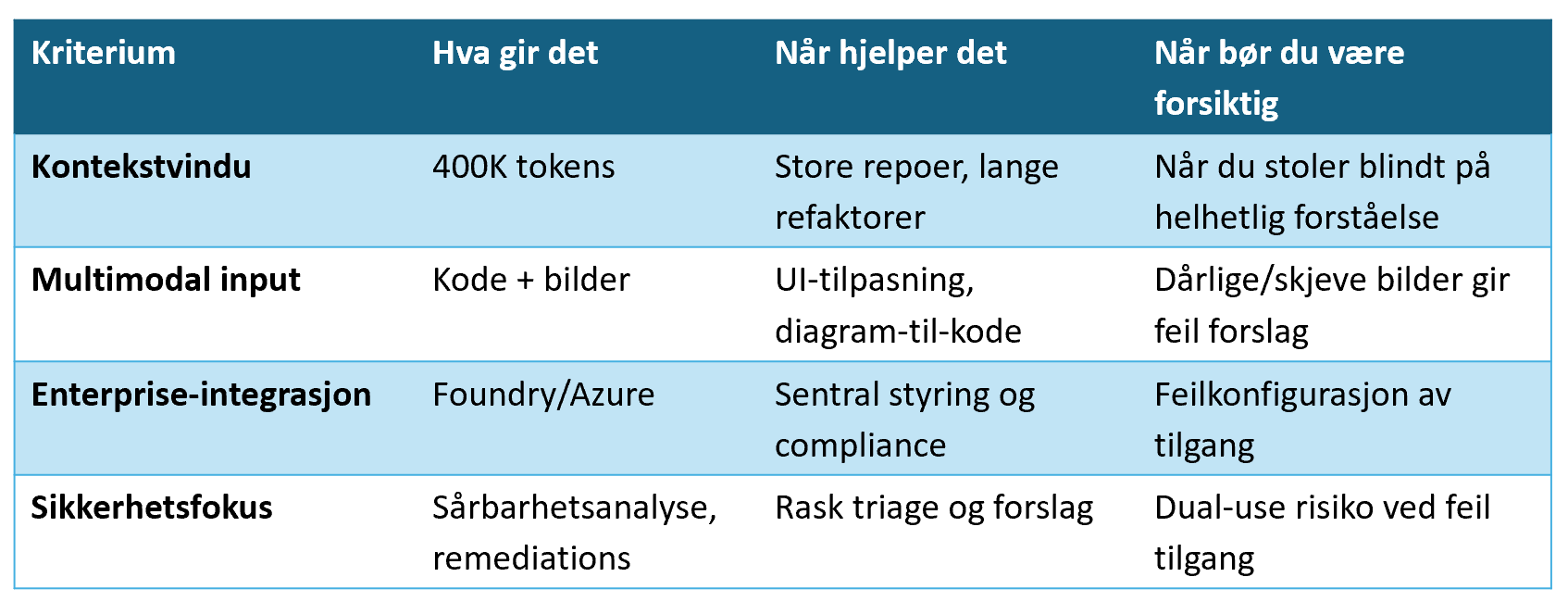At modellen leveres gjennom Microsoft Foundry og Azure betyr at den kan kobles inn i eksisterende verktøy for logging, tilgangsstyring og samsvar. Det gjør det enklere å rulle ut i en organisasjon som allerede bruker Azure, men det betyr ikke at alt blir trygt av seg selv. Du må fortsatt sette opp riktige policyer og tekniske kontroller.